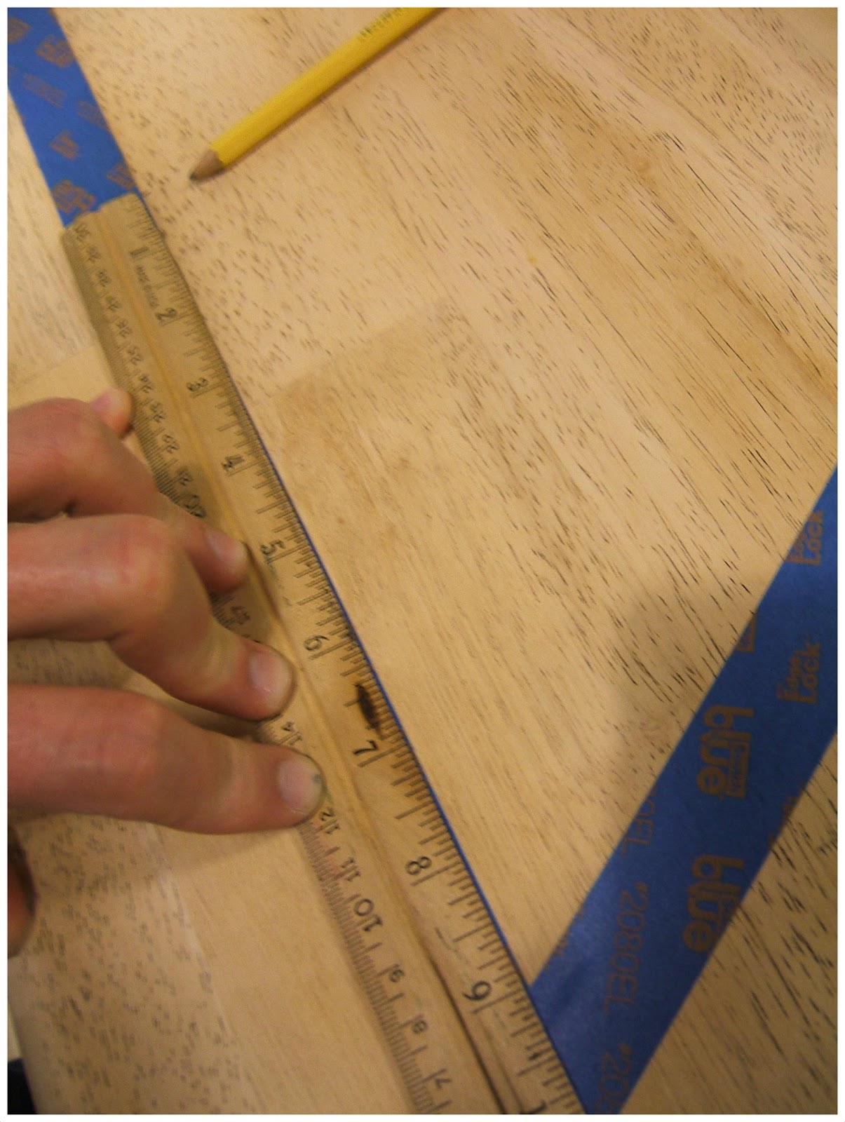 Use your straight edge or yardstick to connect the two points you just made, and place a piece of tape along that edge along the whole table. Now you have a line in which to measure off of. I measured every 9 inches, from that angled line we just made, drew a point, then I used my straight edge to connect all those points with tape. Over and over.