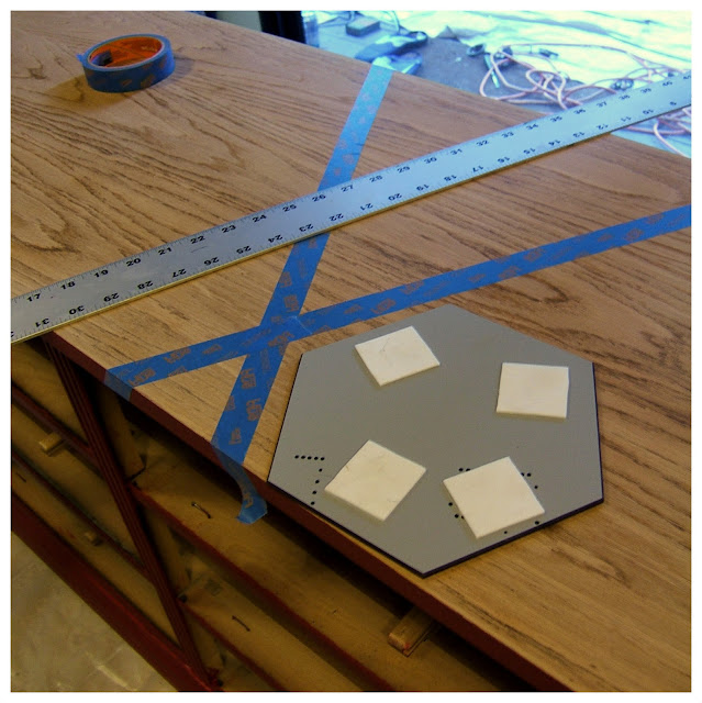 Now we can work on the top while the dresser dries all the way. Get your tape, straight edge, and hexagon. I used a mirror from the Disco ball sun tunnel project. I could have gotten all geometric and figured this out with math, but it was Sunday and that sounded horrible. So I just used an existing hexy as a guide and went with it.