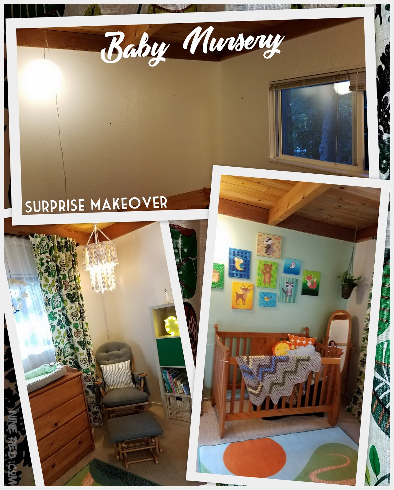 Sarah & Shaun had collected a lot of baby furniture already, and with that ceiling being wood as well, it came together really nicely! Especially for their woodland theme... plus, not having to paint a ceiling & trim was a MAJOR time saver. There were grand dreams of painting furniture at one time, but when you learn you have ONE day to do it, projects hit the chopping block REAL fast. Before I forget, the paint names we used are: